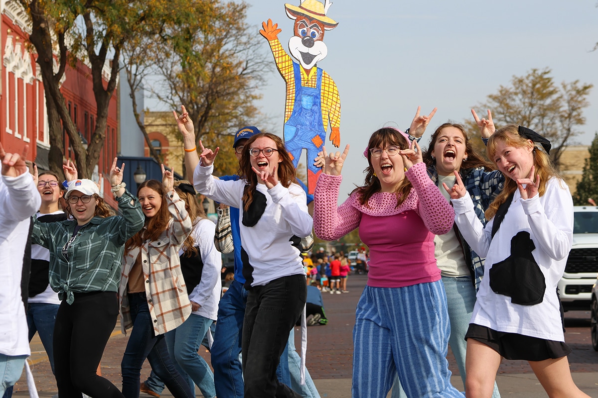As I photographed the parade, I looked for opportunities to get a photograph that didn’t just look like every other parade photo. I decided to sit down on the ground and shoot up so there was just enough of an angle to make the subjects pop out. As I saw these students walking by, their energy and body language screamed school spirit – capturing the true essence of homecoming.
