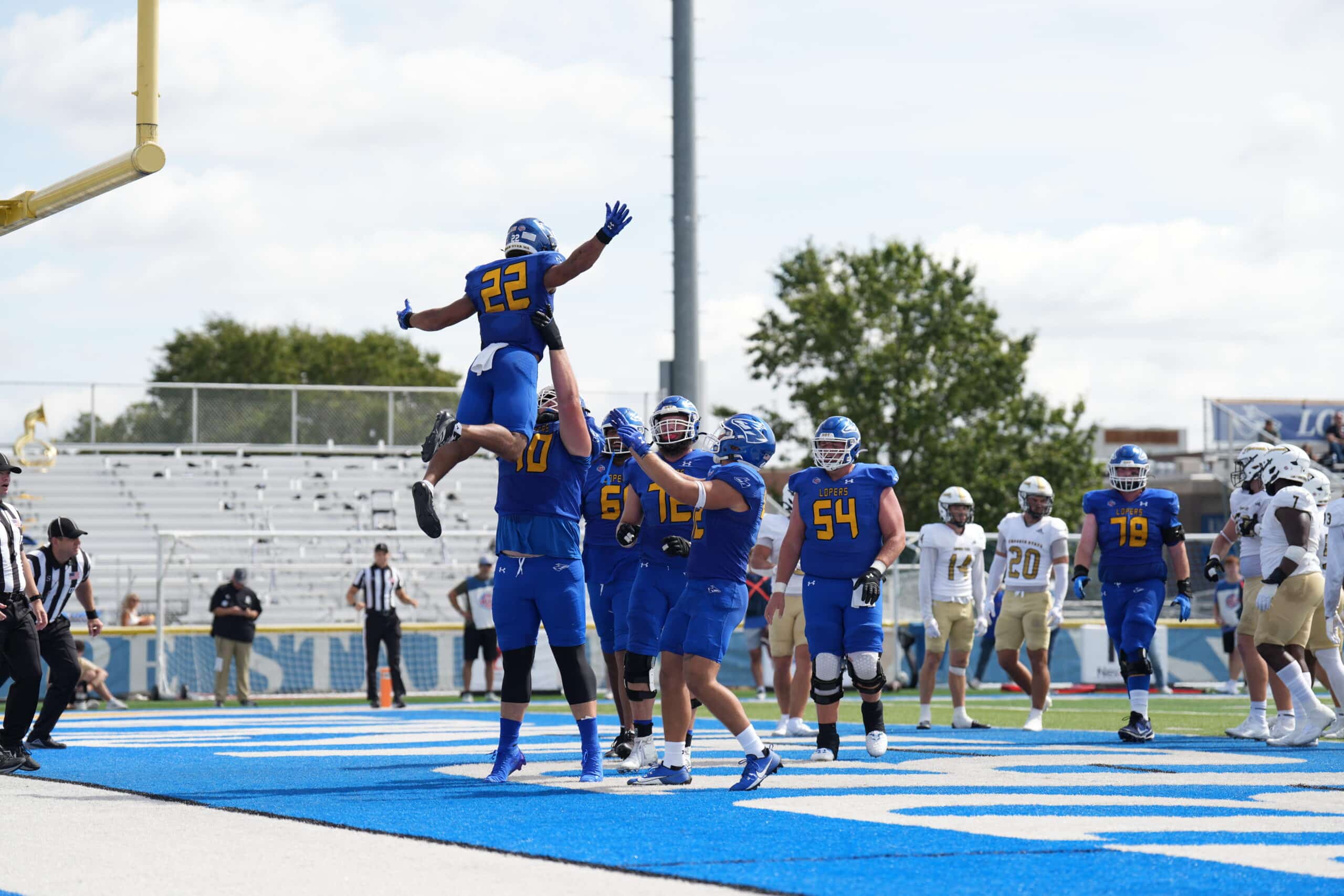 At these two football games, I found myself looking to the players in between and after plays. In the touchdown photo, I kept shooting after the player crossed the end zone. The action of him crossing into touchdown territory was exciting, but I knew football players tend to have a touchdown dance or celebrate in a big way. As I kept shooting, the scorer jumped in the air and was lifted by his teammate. The photo feels victorious, just like how the players felt in that moment and after winning the game.